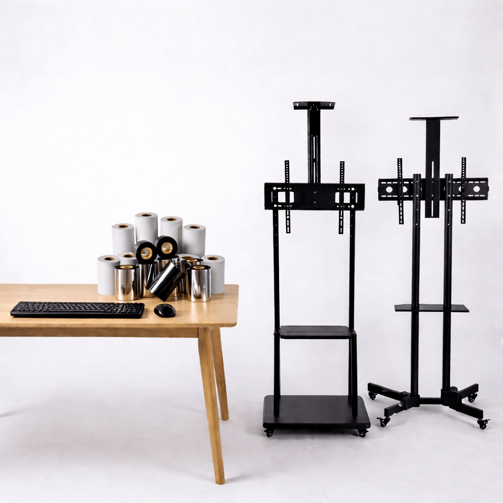 We offer a comprehensive selection of TV and projector brackets and trolleys, complemented by a full range of essential consumables including receipt paper rolls, continuous forms, barcode labels, and ribbons.